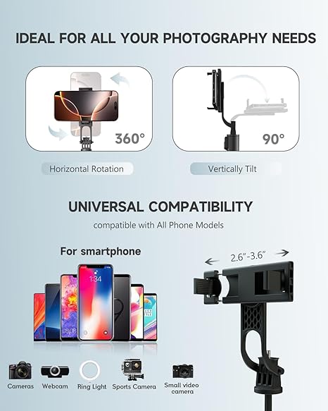 - [360° Rotation & Wide Compatibility] Featuring a 360° rotating phone holder, this selfie stick tripod allows you to easily switch between portrait and landscape modes for the best viewing angle. The universal holder fits smartphones with widths of 2.6”-3.6” (4”-7” screen size) and is compatible with most cameras, action cams, and webcams via the 1/4” screw mount (Note: the remote control function only applies to cell phones, the camera cannot use the remote control function).