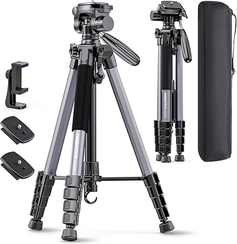 - 74-INCH LIGHTWEIGHT TRIPOD – This is a lightweight tripod that can be adjusted in height from 20 to 74 inches. There is a 1/4 mounting bolt on the quick release plate, suitable for cameras and cell phones. It folds down to just 19 inches for easy portability, making it ideal for frequent changes in shooting locations and travel. Despite its weight of only 2.8 pounds, it can support weights of up to 8.8 pounds.