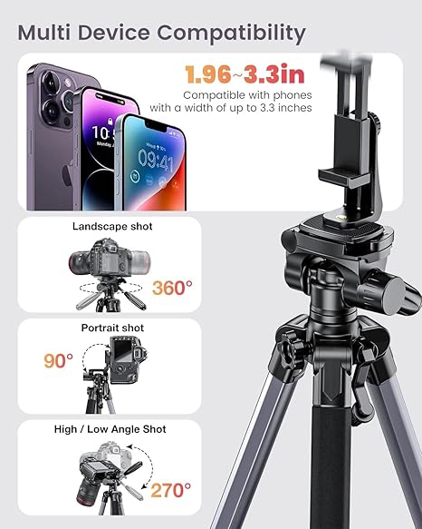 - MULTIFUNCTIONAL TRIPOD – This tripod is versatile, compatible with various devices such as cameras, mirrorless cameras (CSC), ring lights, projectors, and smartphones. It’s ideal for capturing photos and videos at events, parties, travel, hiking, sports events, and for shooting YouTube videos, vlogs, live streams, and online meetings.
